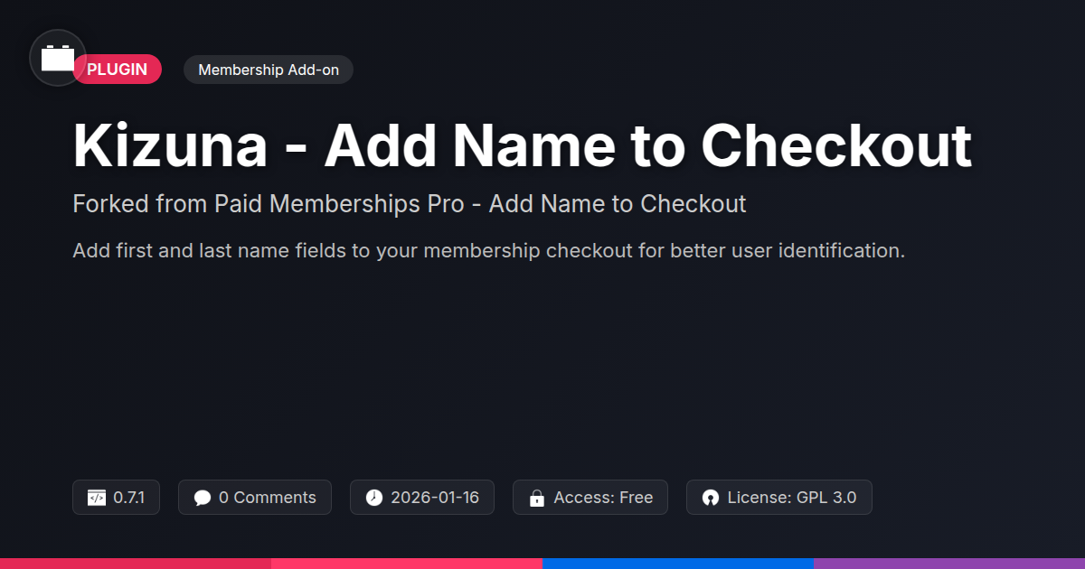 Alright, let's cut to the chase. We've spent this time dissecting the necessity, the sheer, unadulterated need, to know who your paying members are. It’s not rocket science, yet for some reason, in the grand tapestry of membership site setup, this fundamental bit of intel often gets the short end of the stick. You're out there wrestling with complex code, architecting intricate user journeys, and then… you’re left staring at a checkout form that’s about as informative as a mime convention. Kizuna - Add Name to Checkout isn't changing the world, and frankly, it doesn't need to. What it does do is gracefully, and with a certain developer-approved elegance, solve a persistent, irritating problem. It adds those crucial first and last name fields, making your membership onboarding less of a guessing game and more of a data-driven conversation. Think of the hours saved, the client praises earned, the sheer satisfaction of knowing your members’ names without having to resort to interpretive dance during support calls. This isn't about flashy features; it's about robust, essential functionality delivered with the clean engineering we all appreciate. It’s the digital equivalent of ensuring your server rack is labelled correctly – sounds boring, but trust us, future-you will be eternally grateful. So, the next time you’re setting up a membership site and realize you’re one name away from true understanding, you know where to turn. Keep it simple, keep it effective, and keep those names coming.