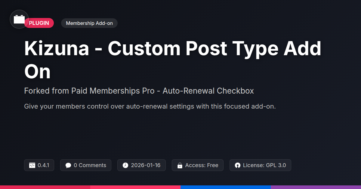 Ever find yourself staring at your membership site, wondering if you accidentally enabled auto-renewals for literally everyone? Or perhaps you've spent more time manually toggling that checkbox than you'd care to admit? We get it. Managing subscriptions can feel like herding digital cats, especially when your users have minds (and credit cards) of their own. What if there was a way to put a little more control, a bit more transparency, and a lot less manual intervention into the subscription process? Enter Kizuna - Custom Post Type Add On, a nifty little tool that takes a core feature of a popular membership plugin and gives it a dedicated, streamlined home. Think of it as giving that crucial auto-renewal setting its own VIP lounge, away from the main party. For developers and agencies who are tired of wrestling with complex configurations or wishing for a more focused approach to managing subscriptions, this fork offers a breath of fresh air. It’s for those who appreciate elegant solutions and understand that sometimes, isolating a feature makes it more powerful, not less. If you’re nodding along, picturing your workflows becoming smoother and your client sites more robust, you’re in the right place. We’re about to dive into how this gem can unclutter your development life and delight your members.