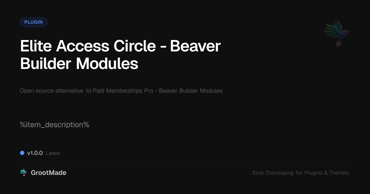 GrootMade is NOT affiliated with Paid Memberships Pro - Beaver Builder Modules or its original author. Paid Memberships Pro - Beaver Builder Modules™ is a trademark of its respective owner and use of it does not imply any endorsement or affiliation. This product has been forked under the GNU General Public License (GPL) and all non-GPL assets (such as proprietary images, fonts, and branding) have been removed. Distributing GPL-licensed code is 100% legal.
