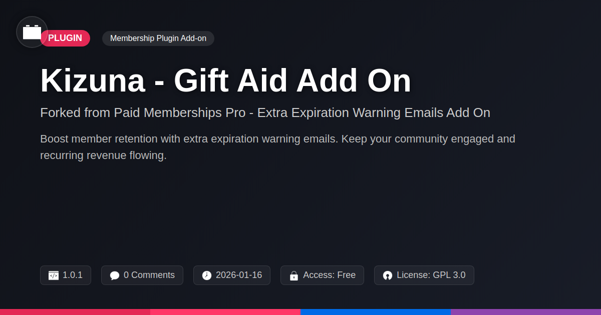 GrootMade is NOT affiliated with Paid Memberships Pro - Extra Expiration Warning Emails Add On or its original author. Paid Memberships Pro - Extra Expiration Warning Emails Add On™ is a trademark of its respective owner and use of it does not imply any endorsement or affiliation. This product has been forked under the GNU General Public License (GPL) and all non-GPL assets (such as proprietary images, fonts, and branding) have been removed. Distributing GPL-licensed code is 100% legal.