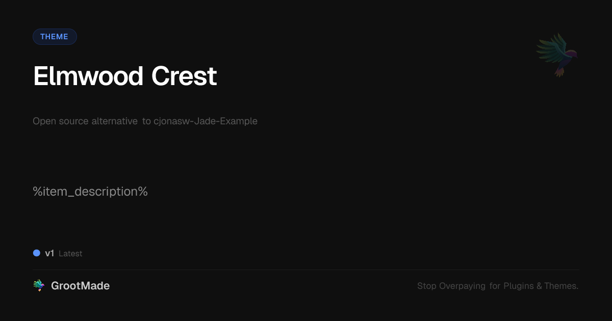 GrootMade is NOT affiliated with cjonasw-Jade-Example or its original author. cjonasw-Jade-Example™ is a trademark of its respective owner and use of it does not imply any endorsement or affiliation. This product has been forked under the GNU General Public License (GPL) and all non-GPL assets (such as proprietary images, fonts, and branding) have been removed. Distributing GPL-licensed code is 100% legal.