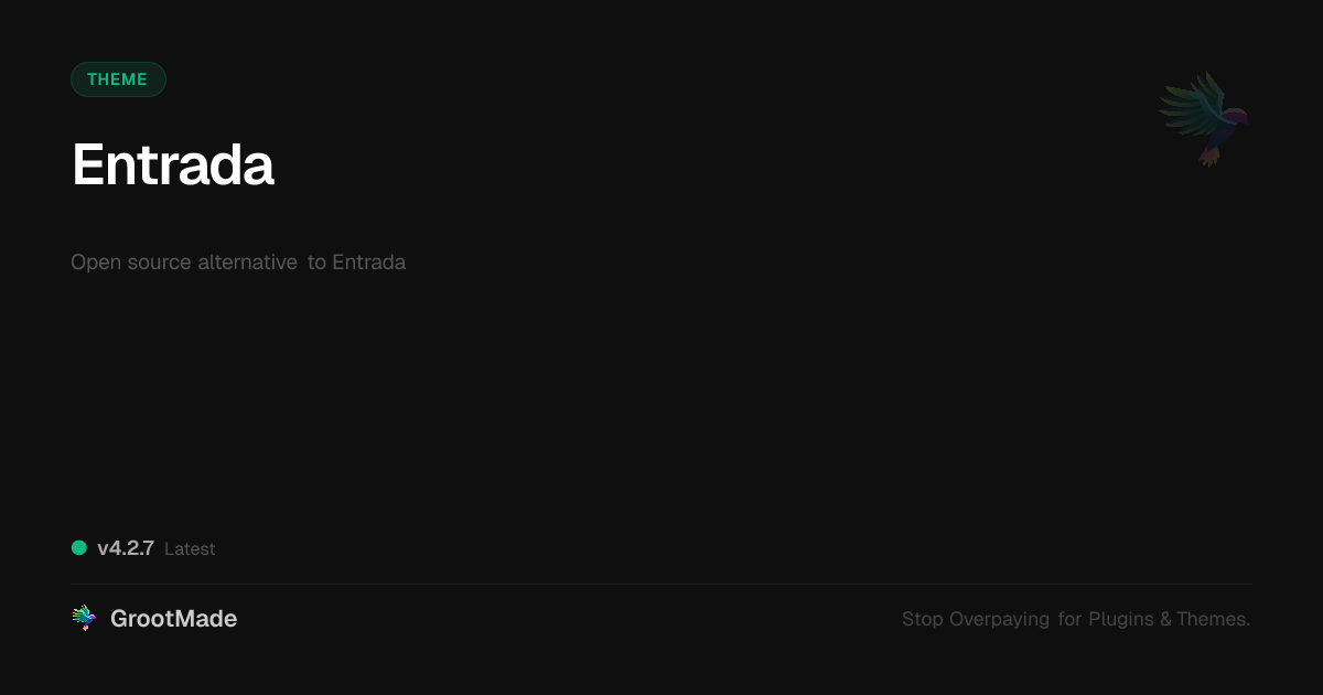 GrootMade is NOT affiliated with Entrada or its original author. Entrada™ is a trademark of its respective owner and use of it does not imply any endorsement or affiliation. This product has been forked under the GNU General Public License (GPL) and all non-GPL assets (such as proprietary images, fonts, and branding) have been removed. Distributing GPL-licensed code is 100% legal.