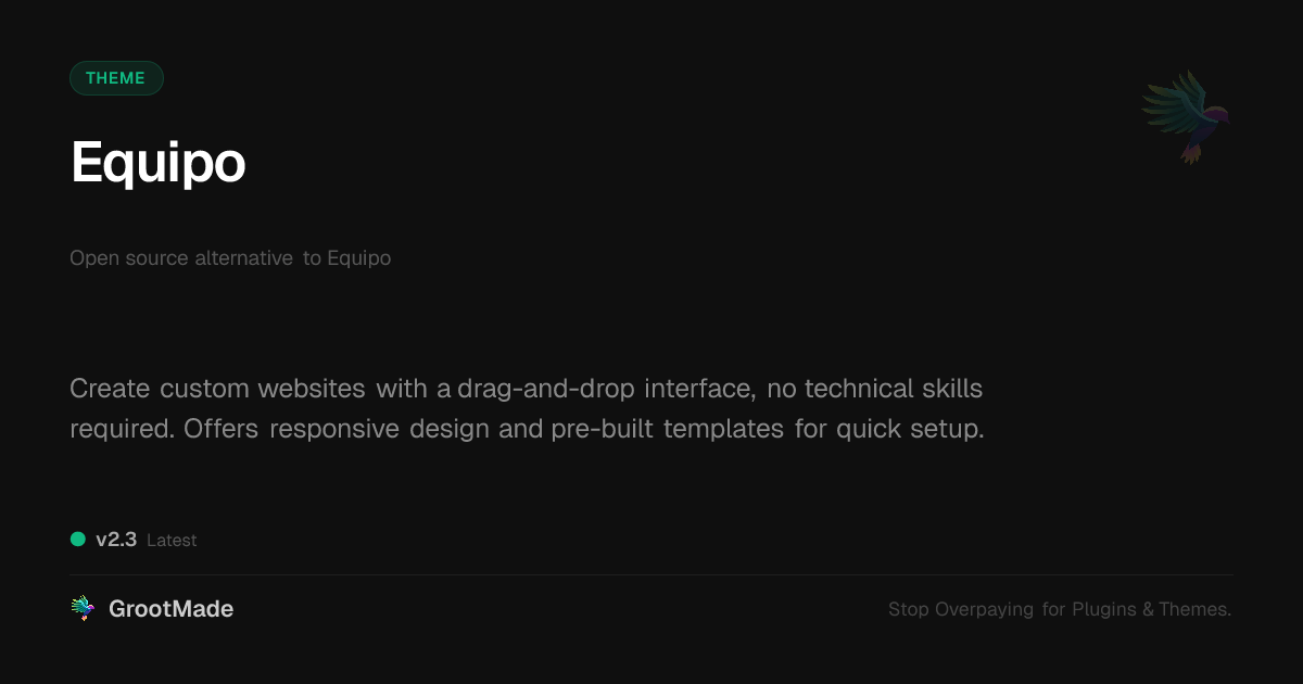 GrootMade is NOT affiliated with Equipo or its original author. Equipo™ is a trademark of its respective owner and use of it does not imply any endorsement or affiliation. This product has been forked under the GNU General Public License (GPL) and all non-GPL assets (such as proprietary images, fonts, and branding) have been removed. Distributing GPL-licensed code is 100% legal.