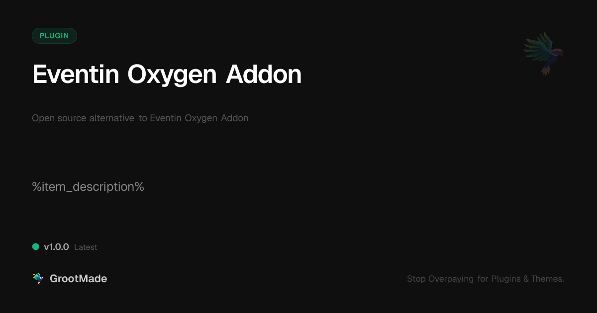 GrootMade is NOT affiliated with Eventin Oxygen Addon or its original author. Eventin Oxygen Addon™ is a trademark of its respective owner and use of it does not imply any endorsement or affiliation. This product has been forked under the GNU General Public License (GPL) and all non-GPL assets (such as proprietary images, fonts, and branding) have been removed. Distributing GPL-licensed code is 100% legal.
