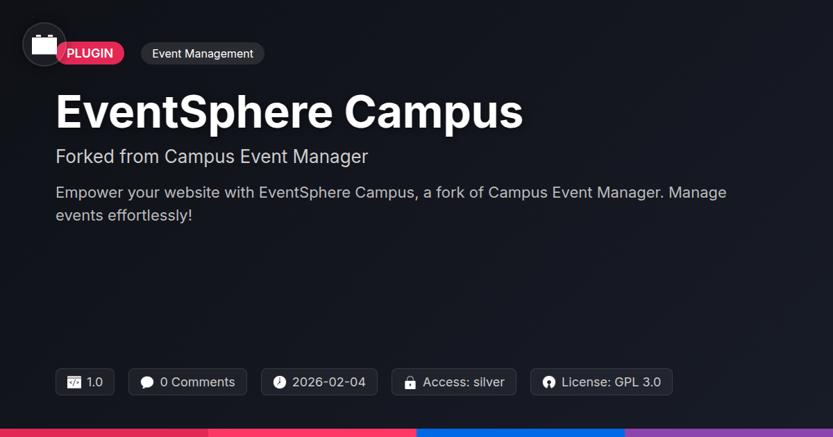 Tired of wrestling with clunky, outdated event management systems that make you want to throw your keyboard out the window? Do you dream of a solution so flexible it practically reads your mind, yet so straightforward your grandma could use it (if she wasn't too busy hosting her own knitting circle event)? Well, stop dreaming and start building! We're thrilled to introduce EventSphere Campus, a project forged from the highly respected Campus Event Manager, now unleashed with a fresh perspective and a boatload of potential for the discerning WP developer. Forget the cookie-cutter solutions; this is about empowering you to craft stellar event experiences for your clients or your own thriving community. Whether you're a seasoned agency guru, a lone wolf developer conquering the open-source frontier, or simply someone who believes their website deserves more than just a static page of dates, EventSphere Campus invites you to a party where the only dress code is awesome. Get ready to ditch the headaches and embrace the elegance of truly organized events.