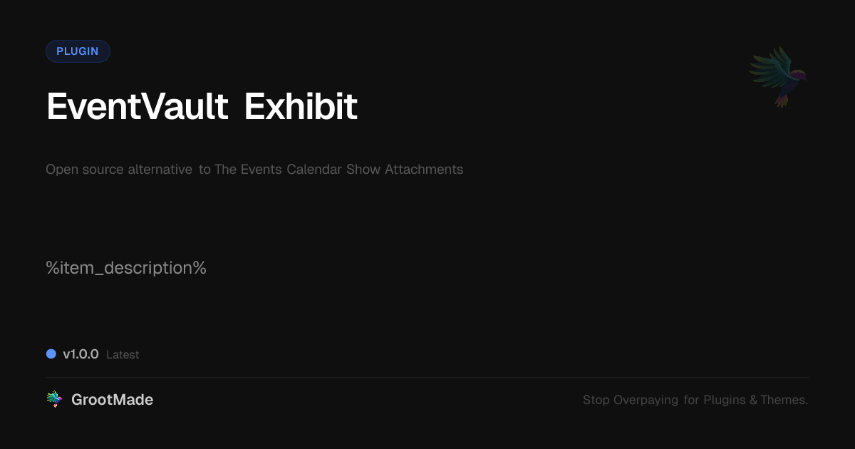 GrootMade is NOT affiliated with The Events Calendar Show Attachments or its original author. The Events Calendar Show Attachments™ is a trademark of its respective owner and use of it does not imply any endorsement or affiliation. This product has been forked under the GNU General Public License (GPL) and all non-GPL assets (such as proprietary images, fonts, and branding) have been removed. Distributing GPL-licensed code is 100% legal.