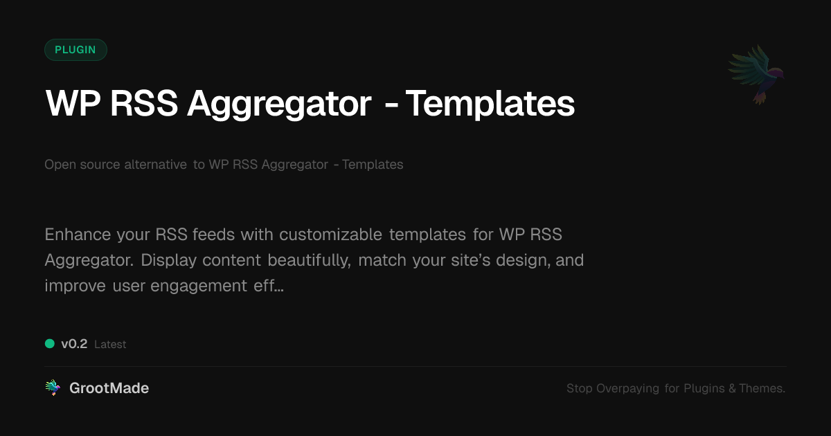 GrootMade is NOT affiliated with WP RSS Aggregator - Templates or its original author. WP RSS Aggregator - Templates™ is a trademark of its respective owner and use of it does not imply any endorsement or affiliation. This product has been forked under the GNU General Public License (GPL) and all non-GPL assets (such as proprietary images, fonts, and branding) have been removed. Distributing GPL-licensed code is 100% legal.