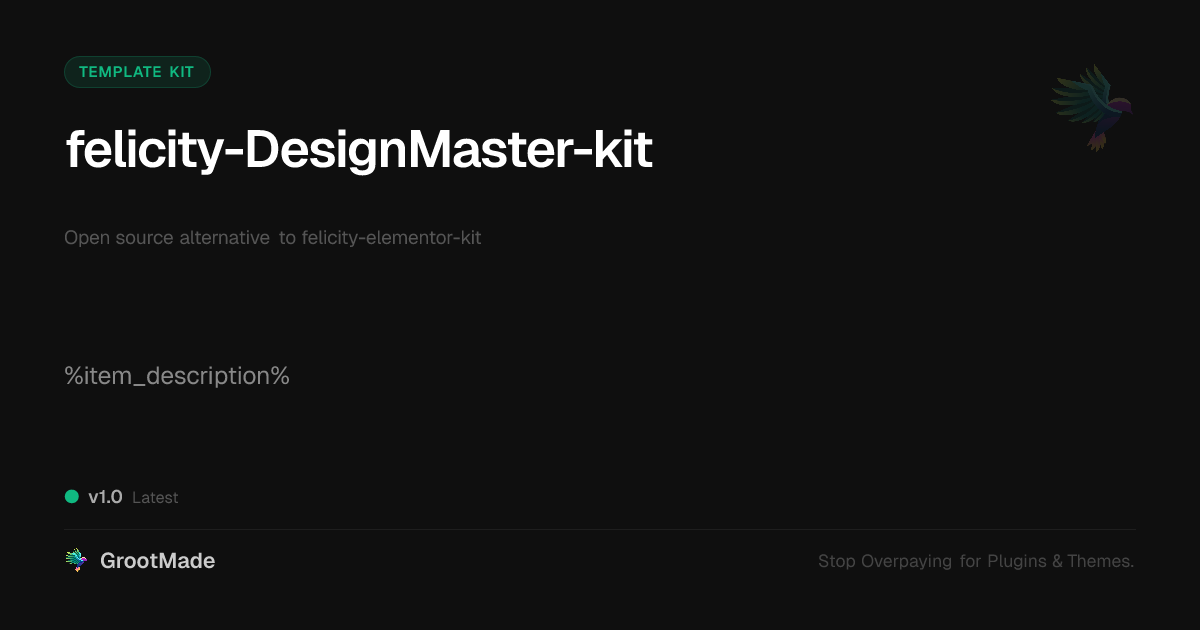 GrootMade is NOT affiliated with felicity-elementor-kit or its original author. felicity-elementor-kit™ is a trademark of its respective owner and use of it does not imply any endorsement or affiliation. This product has been forked under the GNU General Public License (GPL) and all non-GPL assets (such as proprietary images, fonts, and branding) have been removed. Distributing GPL-licensed code is 100% legal.