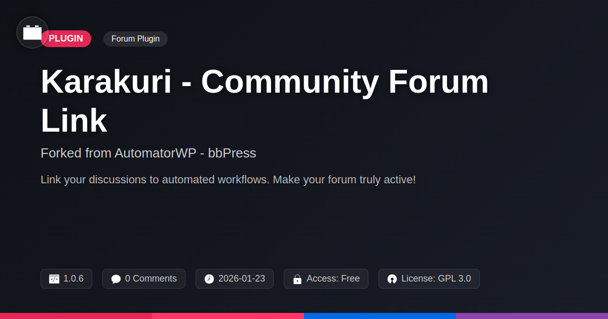 GrootMade is NOT affiliated with AutomatorWP - bbPress or its original author. AutomatorWP - bbPress™ is a trademark of its respective owner and use of it does not imply any endorsement or affiliation. This product has been forked under the GNU General Public License (GPL) and all non-GPL assets (such as proprietary images, fonts, and branding) have been removed. Distributing GPL-licensed code is 100% legal.