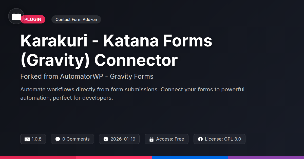 So, you've built a beautiful form. It collects names, emails, maybe even that one obscure piece of data you swear is vital. And then? Crickets. That sweet, sweet data sits there, gathering digital dust. Sound familiar? We get it. The sheer effort of manually sifting through submissions is frankly, depressing. But what if that form submission wasn't just an entry? What if it was a spark? That's where the Karakuri - Katana Forms (Gravity) Connector swoops in. Think of it as the intelligent intermediary. It bridges the gap between data capture and actual . Forget clunky workarounds. This isn't just another plugin; it’s the essential component that transforms your forms from passive data buckets into dynamic launchpads. It’s the 'aha!' moment developers and agency owners crave. Suddenly, your forms aren't just for show. They are the intelligent starting point for your most complex automated workflows. This connector is about seamless integration, pure and simple. It unlocks a new era of efficiency. Your digital operations just got a serious upgrade.