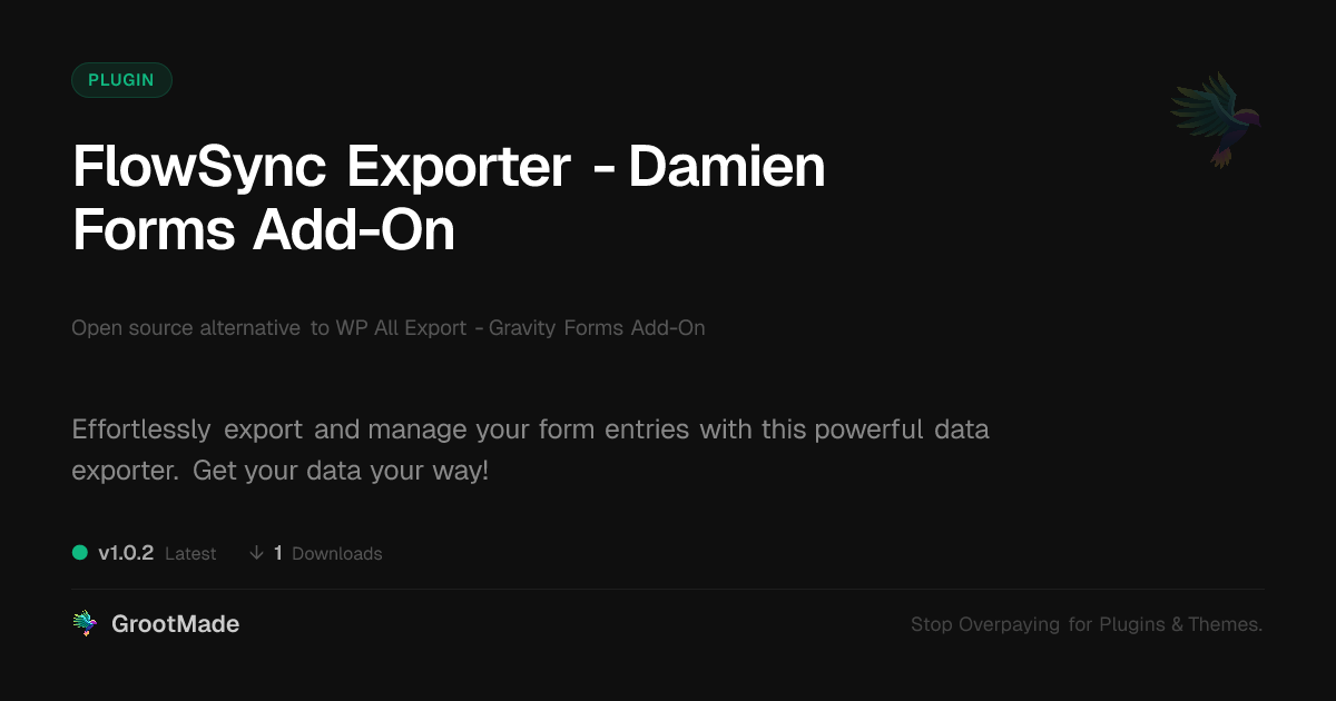 GrootMade is NOT affiliated with WP All Export - Gravity Forms Add-On or its original author. WP All Export - Gravity Forms Add-On™ is a trademark of its respective owner and use of it does not imply any endorsement or affiliation. This product has been forked under the GNU General Public License (GPL) and all non-GPL assets (such as proprietary images, fonts, and branding) have been removed. Distributing GPL-licensed code is 100% legal.
