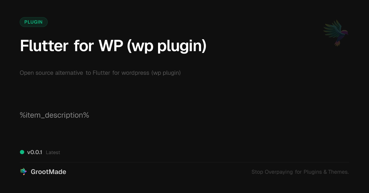 GrootMade is NOT affiliated with Flutter for wordpress (wp plugin) or its original author. Flutter for wordpress (wp plugin)™ is a trademark of its respective owner and use of it does not imply any endorsement or affiliation. This product has been forked under the GNU General Public License (GPL) and all non-GPL assets (such as proprietary images, fonts, and branding) have been removed. Distributing GPL-licensed code is 100% legal.