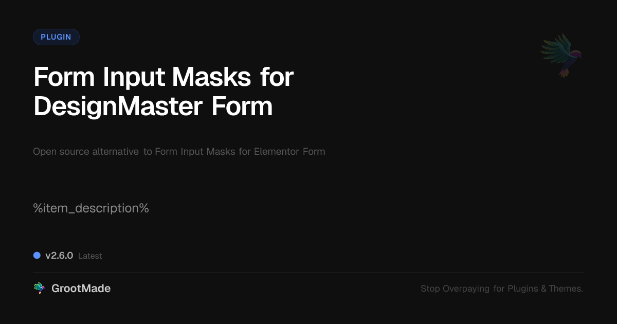 GrootMade is NOT affiliated with Form Input Masks for Elementor Form or its original author. Form Input Masks for Elementor Form™ is a trademark of its respective owner and use of it does not imply any endorsement or affiliation. This product has been forked under the GNU General Public License (GPL) and all non-GPL assets (such as proprietary images, fonts, and branding) have been removed. Distributing GPL-licensed code is 100% legal.