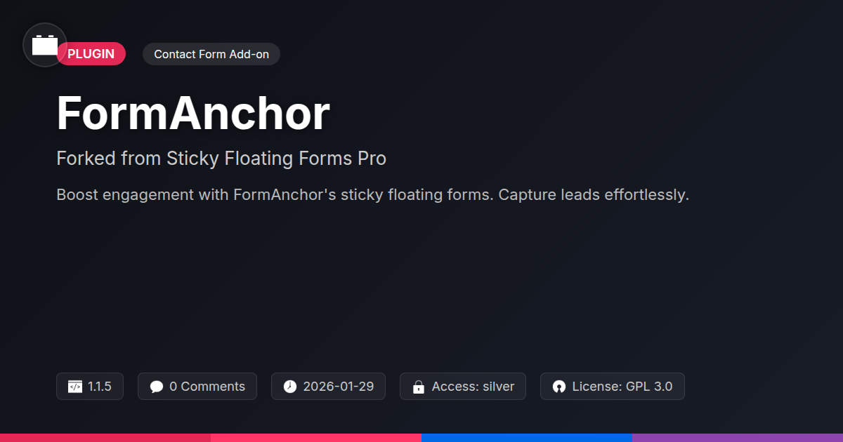 Think about it: you get the power to precisely control where and when your forms appear, ensuring they’re seen by the right eyes at the opportune moment. No more burying critical contact points under layers of content. Plus, with its robust customization options and performance optimizations, you can rest assured your site remains speedy and your users’ experience untroubled. It’s the kind of tool that makes you look like a genius to your clients because you’re delivering results – more leads, better engagement, happier visitors – without the usual headaches. And for the open-source aficionados among us, it’s the clean, transparent, and community-driven solution you’ve been searching for. It’s time to anchor those crucial conversations and watch your conversion rates soar. Let FormAnchor do the heavy lifting, so you can get back to building amazing things.