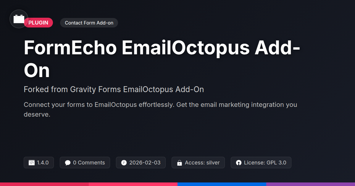 GrootMade is NOT affiliated with Gravity Forms EmailOctopus Add-On or its original author. Gravity Forms EmailOctopus Add-On™ is a trademark of its respective owner and use of it does not imply any endorsement or affiliation. This product has been forked under the GNU General Public License (GPL) and all non-GPL assets (such as proprietary images, fonts, and branding) have been removed. Distributing GPL-licensed code is 100% legal.