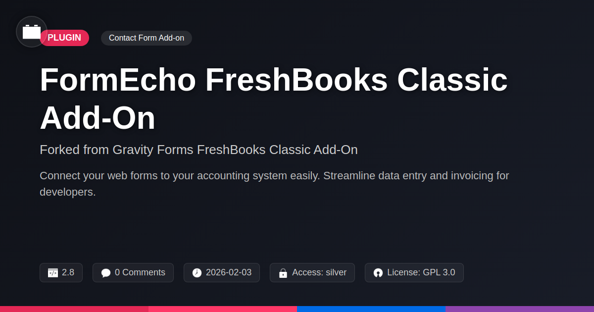 GrootMade is NOT affiliated with Gravity Forms FreshBooks Classic Add-On or its original author. Gravity Forms FreshBooks Classic Add-On™ is a trademark of its respective owner and use of it does not imply any endorsement or affiliation. This product has been forked under the GNU General Public License (GPL) and all non-GPL assets (such as proprietary images, fonts, and branding) have been removed. Distributing GPL-licensed code is 100% legal.