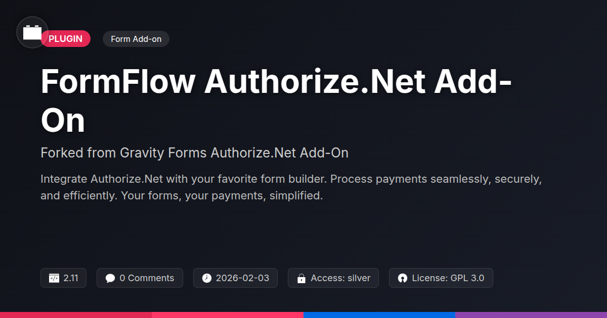 GrootMade is NOT affiliated with Gravity Forms Authorize.Net Add-On or its original author. Gravity Forms Authorize.Net Add-On™ is a trademark of its respective owner and use of it does not imply any endorsement or affiliation. This product has been forked under the GNU General Public License (GPL) and all non-GPL assets (such as proprietary images, fonts, and branding) have been removed. Distributing GPL-licensed code is 100% legal.