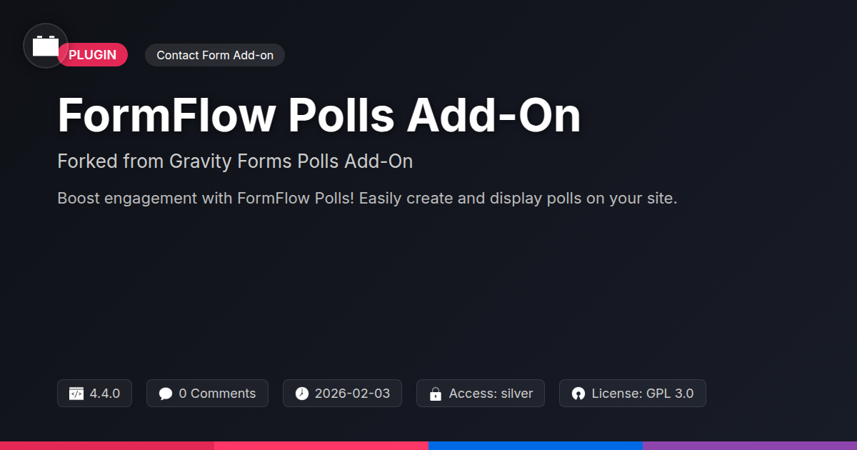 GrootMade is NOT affiliated with Gravity Forms Polls Add-On or its original author. Gravity Forms Polls Add-On™ is a trademark of its respective owner and use of it does not imply any endorsement or affiliation. This product has been forked under the GNU General Public License (GPL) and all non-GPL assets (such as proprietary images, fonts, and branding) have been removed. Distributing GPL-licensed code is 100% legal.