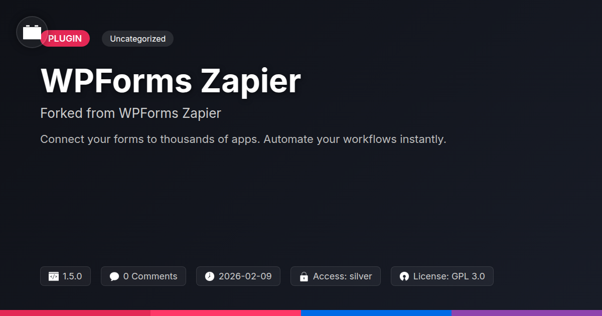 GrootMade is NOT affiliated with WPForms Zapier or its original author. WPForms Zapier™ is a trademark of its respective owner and use of it does not imply any endorsement or affiliation. This product has been forked under the GNU General Public License (GPL) and all non-GPL assets (such as proprietary images, fonts, and branding) have been removed. Distributing GPL-licensed code is 100% legal.