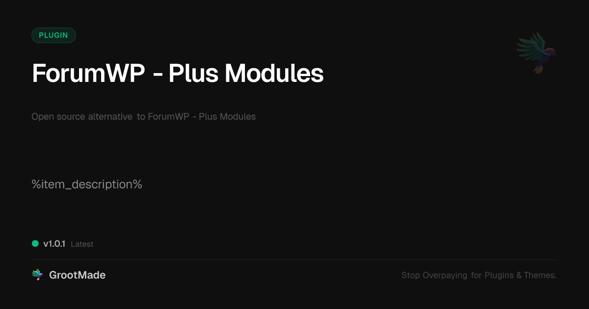 GrootMade is NOT affiliated with ForumWP - Plus Modules or its original author. ForumWP - Plus Modules™ is a trademark of its respective owner and use of it does not imply any endorsement or affiliation. This product has been forked under the GNU General Public License (GPL) and all non-GPL assets (such as proprietary images, fonts, and branding) have been removed. Distributing GPL-licensed code is 100% legal.