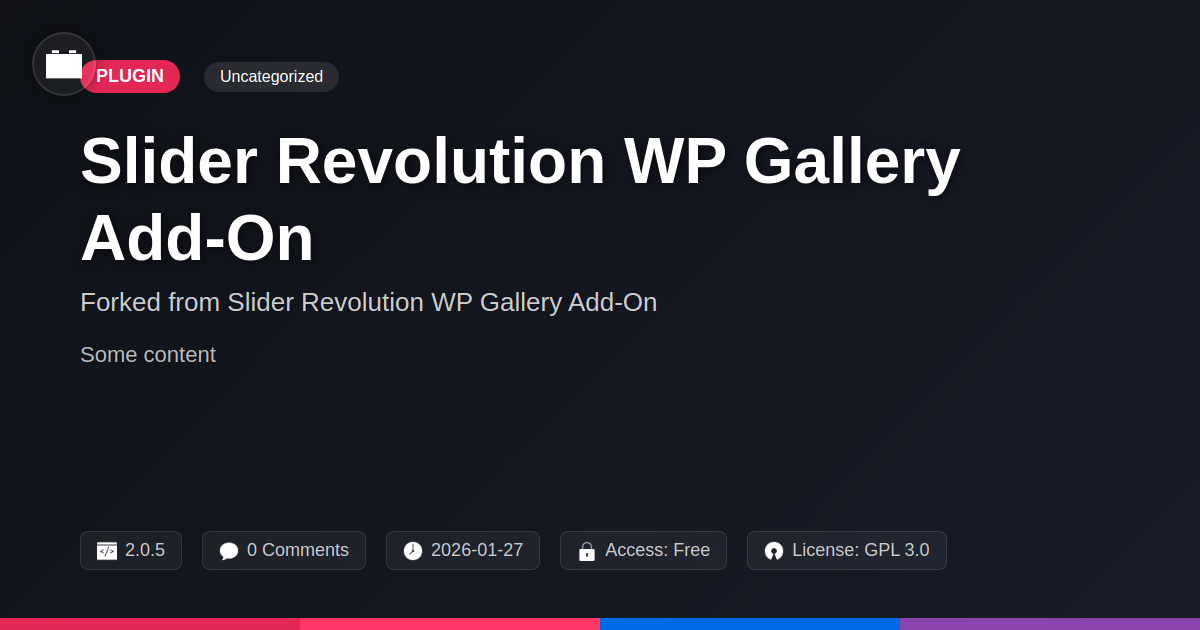 GrootMade is NOT affiliated with Slider Revolution WP Gallery Add-On or its original author. Slider Revolution WP Gallery Add-On™ is a trademark of its respective owner and use of it does not imply any endorsement or affiliation. This product has been forked under the GNU General Public License (GPL) and all non-GPL assets (such as proprietary images, fonts, and branding) have been removed. Distributing GPL-licensed code is 100% legal.