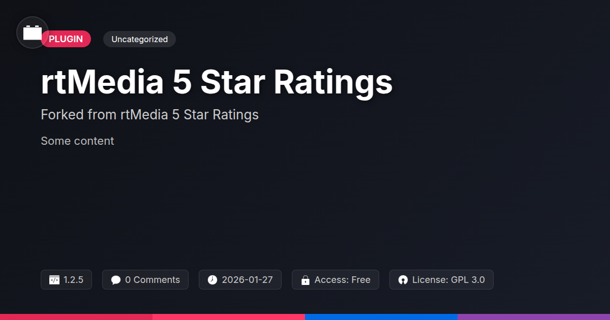 GrootMade is NOT affiliated with rtMedia 5 Star Ratings or its original author. rtMedia 5 Star Ratings™ is a trademark of its respective owner and use of it does not imply any endorsement or affiliation. This product has been forked under the GNU General Public License (GPL) and all non-GPL assets (such as proprietary images, fonts, and branding) have been removed. Distributing GPL-licensed code is 100% legal.