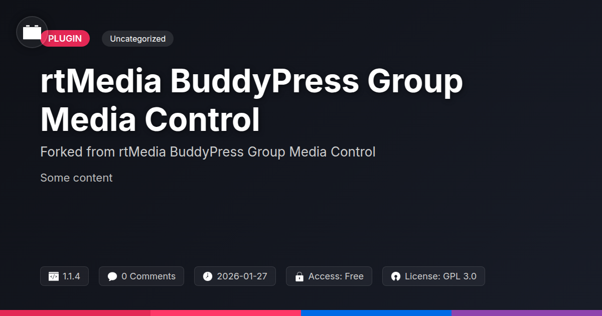 GrootMade is NOT affiliated with rtMedia BuddyPress Group Media Control or its original author. rtMedia BuddyPress Group Media Control™ is a trademark of its respective owner and use of it does not imply any endorsement or affiliation. This product has been forked under the GNU General Public License (GPL) and all non-GPL assets (such as proprietary images, fonts, and branding) have been removed. Distributing GPL-licensed code is 100% legal.