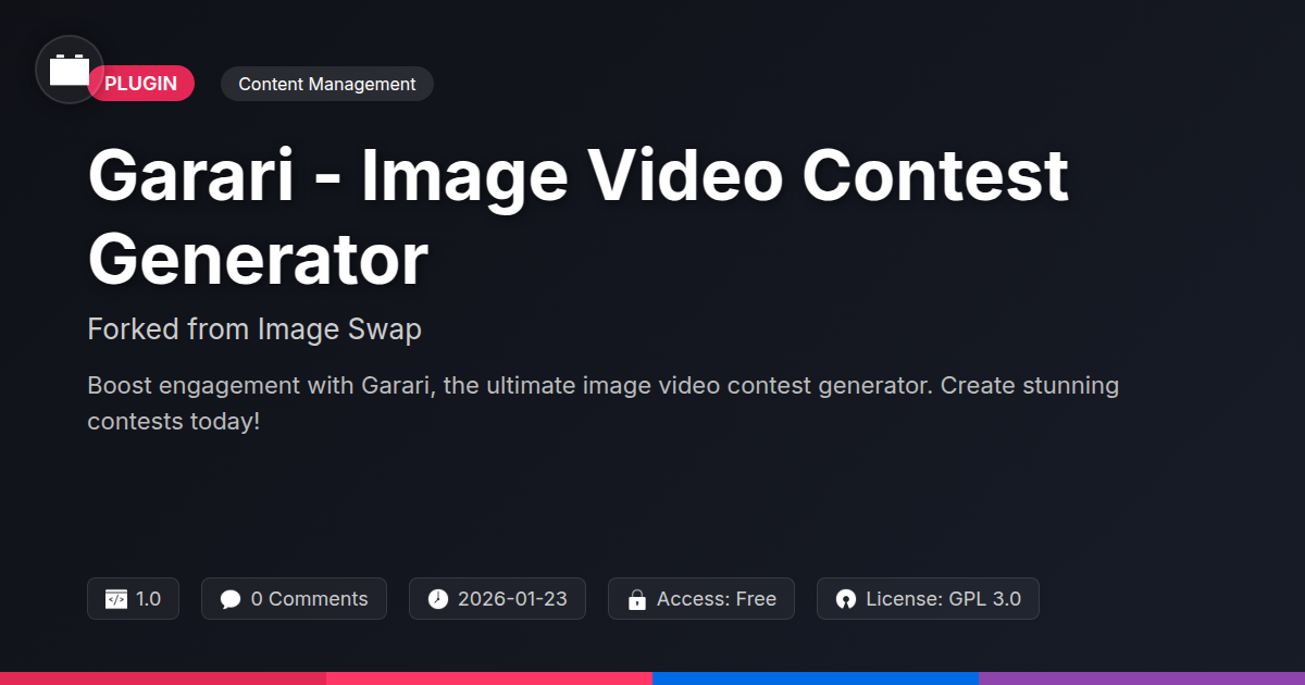 So, there you have it. If your website has been feeling a bit too much like a waiting room and not enough like a lively exhibition hall, it's time for an intervention. We've explored how transforming your site into a dynamic hub for image and video contests isn't just a novel idea; it's a strategic move to breathe life, engagement, and genuine community into your digital space. We've unveiled Garari - Image Video Contest Generator as your not-so-secret weapon, a tool forged from solid foundations, designed to empower creators, and built with the discerning developer and agency in mind. Forget the days of passive content consumption; it's time to unleash user-generated brilliance. Whether you're aiming to spark viral campaigns, foster a loyal community, or simply make your website an undeniably more exciting place to be, this plugin offers the robust, flexible, and adaptable solution you've been searching for. It’s about moving beyond mere functionality to embrace a philosophy of shared creativity and user empowerment. For the code aficionados, the design mavens, and the open-source aficionados, this plugin represents an opportunity to build, customize, and integrate with ease, respecting the elegant architecture and offering the freedom to truly make it your own. Don't let your online presence become a relic of static content. It's time to host contests that captivate, engage, and deliver results. Your audience is waiting to show you what they've got – are you ready to give them the stage?