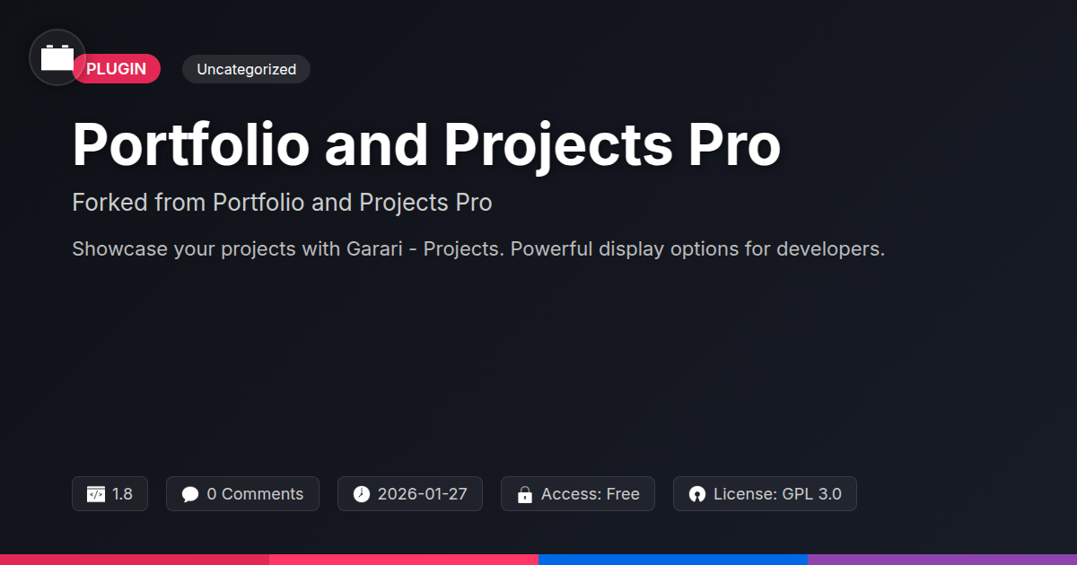 GrootMade is NOT affiliated with Portfolio and Projects Pro or its original author. Portfolio and Projects Pro™ is a trademark of its respective owner and use of it does not imply any endorsement or affiliation. This product has been forked under the GNU General Public License (GPL) and all non-GPL assets (such as proprietary images, fonts, and branding) have been removed. Distributing GPL-licensed code is 100% legal.