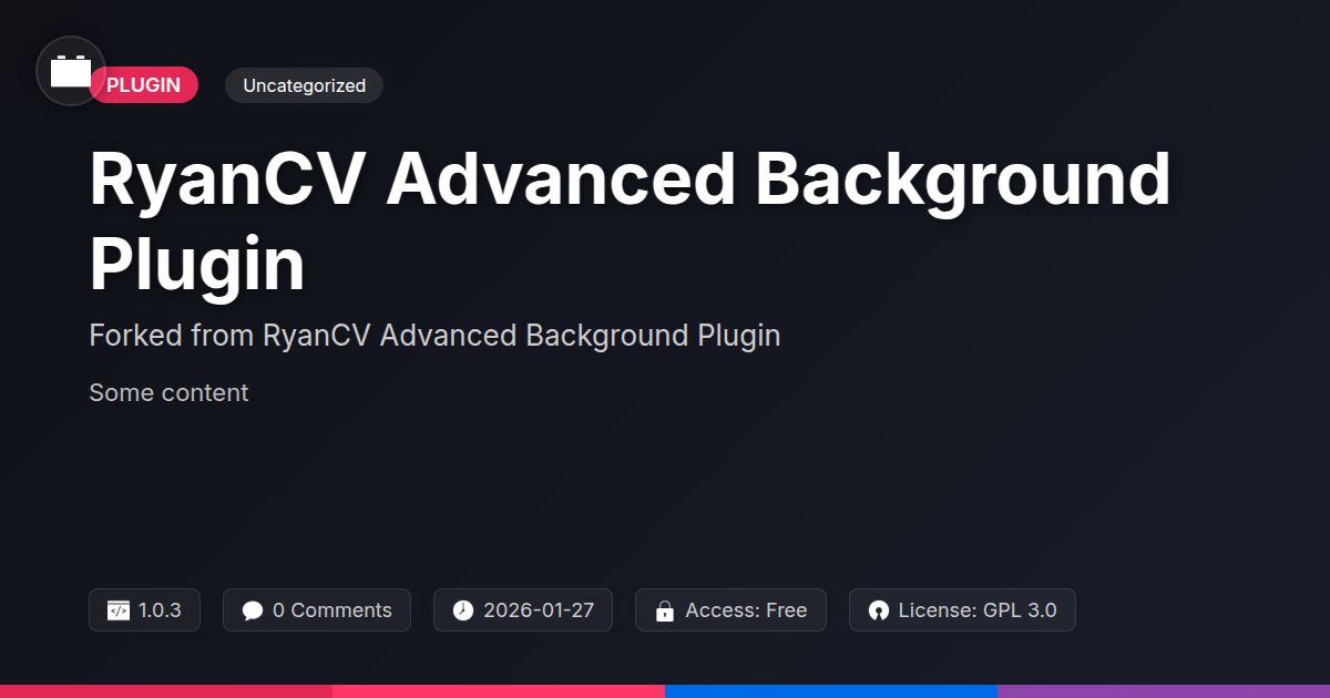 GrootMade is NOT affiliated with RyanCV Advanced Background Plugin or its original author. RyanCV Advanced Background Plugin™ is a trademark of its respective owner and use of it does not imply any endorsement or affiliation. This product has been forked under the GNU General Public License (GPL) and all non-GPL assets (such as proprietary images, fonts, and branding) have been removed. Distributing GPL-licensed code is 100% legal.