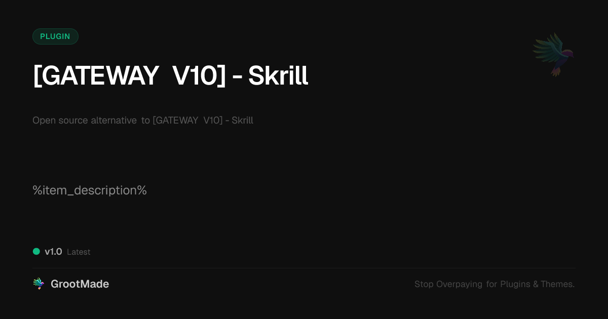 GrootMade is NOT affiliated with [GATEWAY V10] - Skrill or its original author. [GATEWAY V10] - Skrill™ is a trademark of its respective owner and use of it does not imply any endorsement or affiliation. This product has been forked under the GNU General Public License (GPL) and all non-GPL assets (such as proprietary images, fonts, and branding) have been removed. Distributing GPL-licensed code is 100% legal.