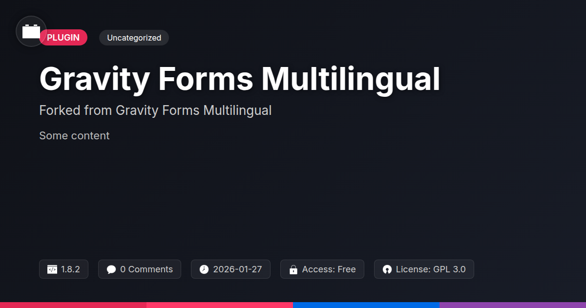 GrootMade is NOT affiliated with Gravity Forms Multilingual or its original author. Gravity Forms Multilingual™ is a trademark of its respective owner and use of it does not imply any endorsement or affiliation. This product has been forked under the GNU General Public License (GPL) and all non-GPL assets (such as proprietary images, fonts, and branding) have been removed. Distributing GPL-licensed code is 100% legal.