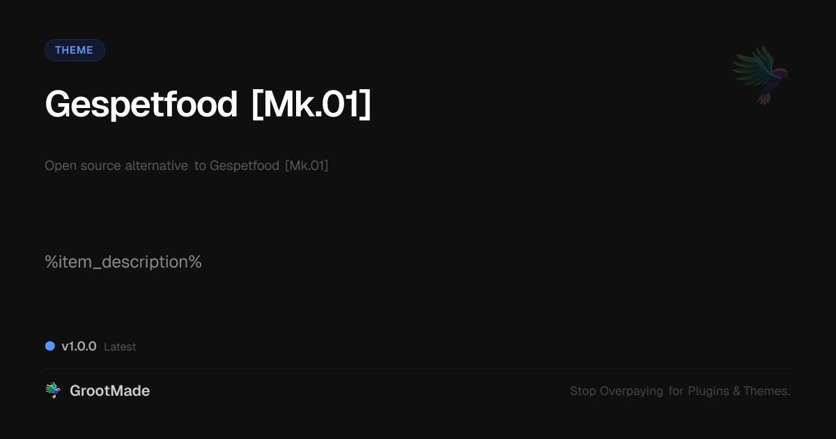 GrootMade is NOT affiliated with Gespetfood [Mk.01] or its original author. Gespetfood [Mk.01]™ is a trademark of its respective owner and use of it does not imply any endorsement or affiliation. This product has been forked under the GNU General Public License (GPL) and all non-GPL assets (such as proprietary images, fonts, and branding) have been removed. Distributing GPL-licensed code is 100% legal.