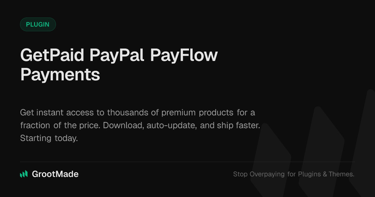 GrootMade is NOT affiliated with GetPaid PayPal PayFlow Payments or its original author. GetPaid PayPal PayFlow Payments™ is a trademark of its respective owner and use of it does not imply any endorsement or affiliation. This product has been forked under the GNU General Public License (GPL) and all non-GPL assets (such as proprietary images, fonts, and branding) have been removed. Distributing GPL-licensed code is 100% legal.