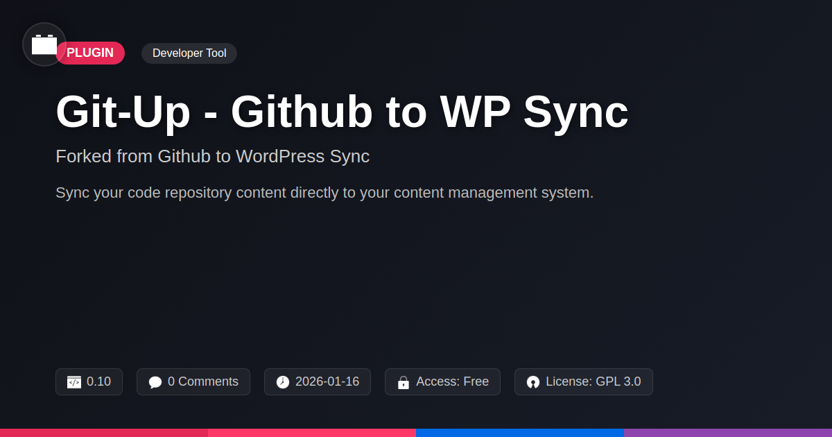 GrootMade is NOT affiliated with Github to WordPress Sync or its original author. Github to WordPress Sync™ is a trademark of its respective owner and use of it does not imply any endorsement or affiliation. This product has been forked under the GNU General Public License (GPL) and all non-GPL assets (such as proprietary images, fonts, and branding) have been removed. Distributing GPL-licensed code is 100% legal.