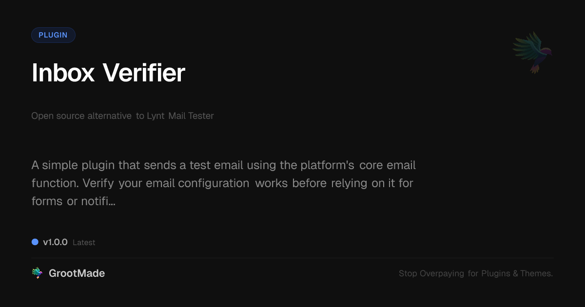 GrootMade is NOT affiliated with Lynt Mail Tester or its original author. Lynt Mail Tester™ is a trademark of its respective owner and use of it does not imply any endorsement or affiliation. This product has been forked under the GNU General Public License (GPL) and all non-GPL assets (such as proprietary images, fonts, and branding) have been removed. Distributing GPL-licensed code is 100% legal.