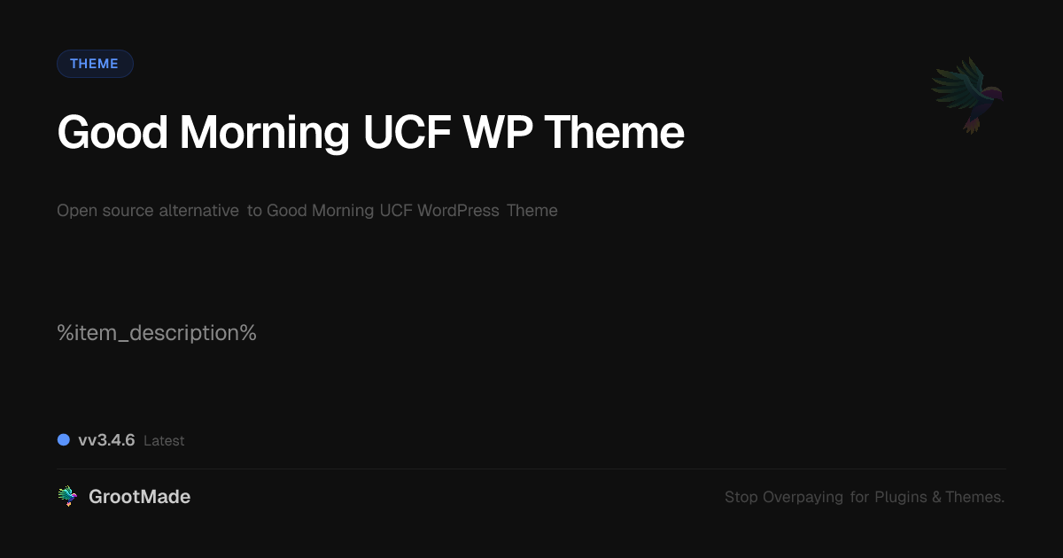 GrootMade is NOT affiliated with Good Morning UCF WordPress Theme or its original author. Good Morning UCF WordPress Theme™ is a trademark of its respective owner and use of it does not imply any endorsement or affiliation. This product has been forked under the GNU General Public License (GPL) and all non-GPL assets (such as proprietary images, fonts, and branding) have been removed. Distributing GPL-licensed code is 100% legal.