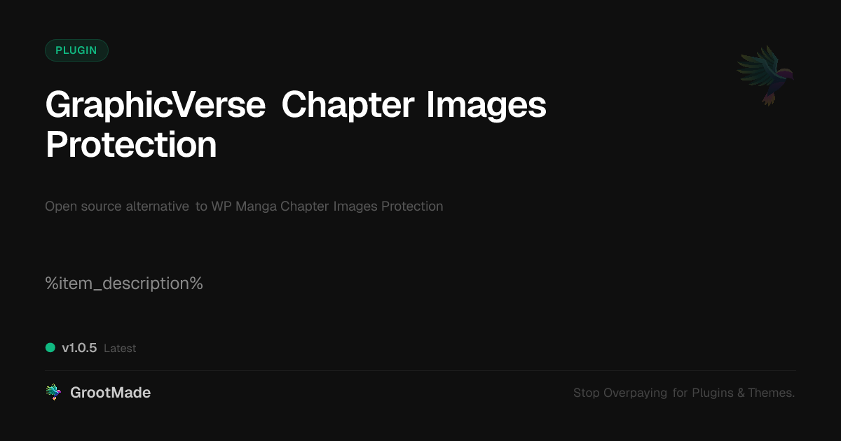 GrootMade is NOT affiliated with WP Manga Chapter Images Protection or its original author. WP Manga Chapter Images Protection™ is a trademark of its respective owner and use of it does not imply any endorsement or affiliation. This product has been forked under the GNU General Public License (GPL) and all non-GPL assets (such as proprietary images, fonts, and branding) have been removed. Distributing GPL-licensed code is 100% legal.