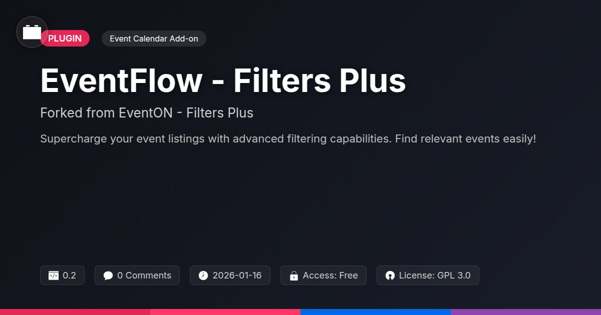 GrootMade is NOT affiliated with EventON - Filters Plus or its original author. EventON - Filters Plus™ is a trademark of its respective owner and use of it does not imply any endorsement or affiliation. This product has been forked under the GNU General Public License (GPL) and all non-GPL assets (such as proprietary images, fonts, and branding) have been removed. Distributing GPL-licensed code is 100% legal.