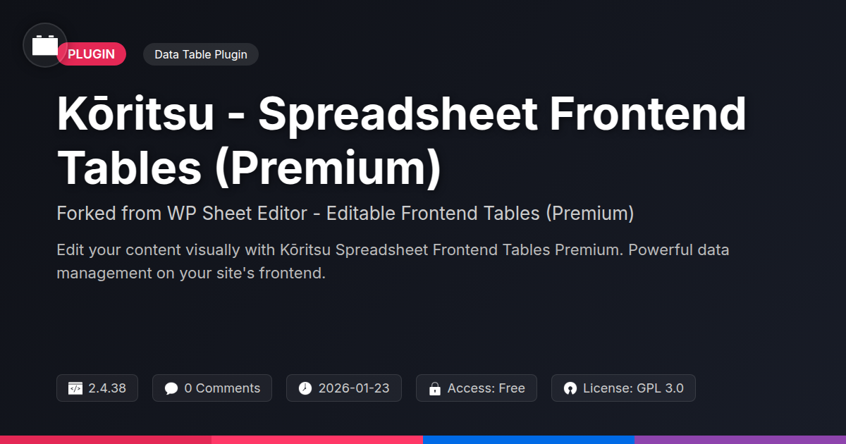 Feelin' like you're navigating a digital labyrinth just to update a few entries on your site? Sick of the backend admin panel feeling like a relic from a bygone era, where every click is a chore and every edit is an adventure in patience? What if you could ditch the tedious process and manage your content with the familiar, glorious grid of a spreadsheet, right on your website's frontend? Kōritsu - Spreadsheet Frontend Tables (Premium) is here to liberate you from the tyranny of the admin panel. This isn't just another plugin; it's your new best friend for content management, built for those who appreciate efficiency, power, and maybe a good sarcastic remark about the status quo. Imagine editing product details, managing user lists, or updating custom fields with the speed and ease you'd expect from your favorite spreadsheet software, but with the power and integration of your content management system. We've taken the battle-tested reliability of the original, polished it until it shines, and offered it up for a whole new community of developers, agencies, and open-source enthusiasts. If you're nodding along, questioning the universe's cruel joke of inefficient data handling, then buckle up. It's time to bring your content management into the 21st century, with a tool that respects your time and your sanity.