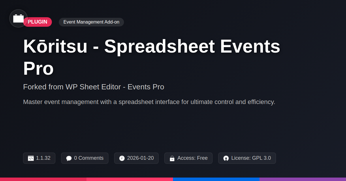 Are you tired of wrestling with clunky interfaces and endless data entry when managing your site's events? Did you ever wish you could just, you know, spreadsheet your way through it all? Well, strap in, fellow code wranglers and agency overlords, because Kōritsu - Spreadsheet Events Pro is here to rescue your sanity. Forked from a solid foundation, this is not your grandma's event calendar plugin. We're talking about taking the pain out of event management and replacing it with the sweet, sweet efficiency of a spreadsheet. Think bulk editing, massive imports, and exports that don't make you want to chew your own arm off. If your current event system feels like it was built by a committee of caffeinated squirrels, you're in the right place. We understand the developer's plight – the need for speed, the desire for control, and the inherent distrust of anything that requires more than five clicks to accomplish a simple task. This is for the tinkerers, the optimizers, the ones who dream in data and crave elegant solutions. Forget complex databases and frustrating forms; embrace the power of the grid. We're about to dive into how this gem can transform how you handle everything from tiny meetups to global conferences, without sacrificing an ounce of developer-friendly control or open-source ethos.