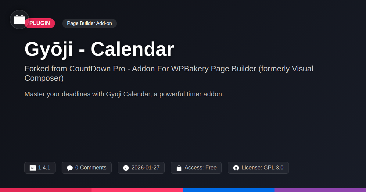 So, have we convinced you that time management on your website doesn't have to be a snooze-fest? We hope so. Because let's be honest, in the wild world of web development, where deadlines loom larger than a poorly optimized image file, having a tool that can handle your temporal needs with a bit of flair and a lot of flexibility is practically a superpower. Gyōji - Calendar, born from a solid lineage and aiming for the stars, offers precisely that. It's not just about sticking a countdown on a page; it's about crafting experiences, building anticipation, and ensuring your audience is always in the loop – all without pulling your hair out. For the developers, the agencies, and the open-source enthusiasts who appreciate a tool that's both powerful and a joy to wield, this add-on is a no-brainer. It’s the upgrade your page builder has been begging for, the missing piece in your toolkit that translates client visions into engaging realities. Stop wrestling with clunky interfaces and embrace a solution that’s as dynamic as your projects. Go ahead, give your timelines the glow-up they deserve.