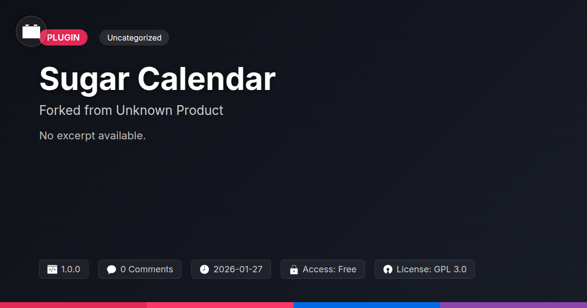 GrootMade is NOT affiliated with Sugar Calendar - Frontend Event Submissions or its original author. Sugar Calendar - Frontend Event Submissions™ is a trademark of its respective owner and use of it does not imply any endorsement or affiliation. This product has been forked under the GNU General Public License (GPL) and all non-GPL assets (such as proprietary images, fonts, and branding) have been removed. Distributing GPL-licensed code is 100% legal.