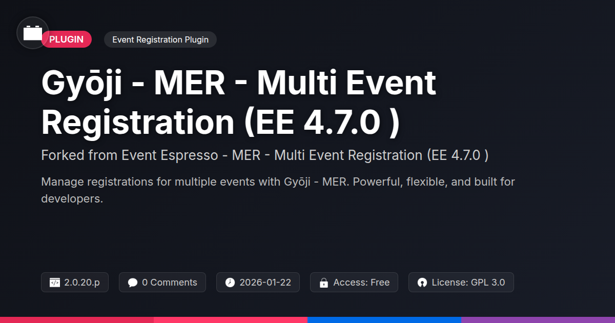 GrootMade is NOT affiliated with Event Espresso - MER - Multi Event Registration (EE 4.7.0+) or its original author. Event Espresso - MER - Multi Event Registration (EE 4.7.0+)™ is a trademark of its respective owner and use of it does not imply any endorsement or affiliation. This product has been forked under the GNU General Public License (GPL) and all non-GPL assets (such as proprietary images, fonts, and branding) have been removed. Distributing GPL-licensed code is 100% legal.