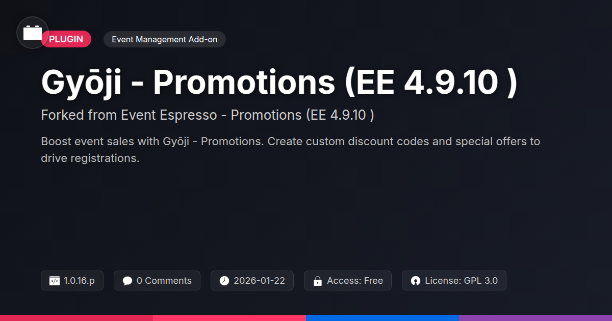 GrootMade is NOT affiliated with Event Espresso - Promotions (EE 4.9.10+) or its original author. Event Espresso - Promotions (EE 4.9.10+)™ is a trademark of its respective owner and use of it does not imply any endorsement or affiliation. This product has been forked under the GNU General Public License (GPL) and all non-GPL assets (such as proprietary images, fonts, and branding) have been removed. Distributing GPL-licensed code is 100% legal.