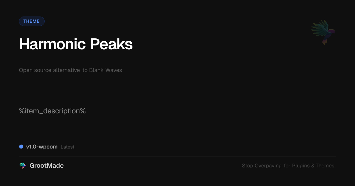 GrootMade is NOT affiliated with Blank Waves or its original author. Blank Waves™ is a trademark of its respective owner and use of it does not imply any endorsement or affiliation. This product has been forked under the GNU General Public License (GPL) and all non-GPL assets (such as proprietary images, fonts, and branding) have been removed. Distributing GPL-licensed code is 100% legal.