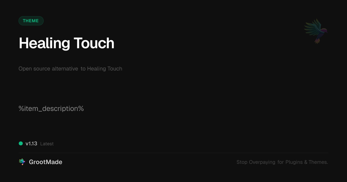 GrootMade is NOT affiliated with Healing Touch or its original author. Healing Touch™ is a trademark of its respective owner and use of it does not imply any endorsement or affiliation. This product has been forked under the GNU General Public License (GPL) and all non-GPL assets (such as proprietary images, fonts, and branding) have been removed. Distributing GPL-licensed code is 100% legal.