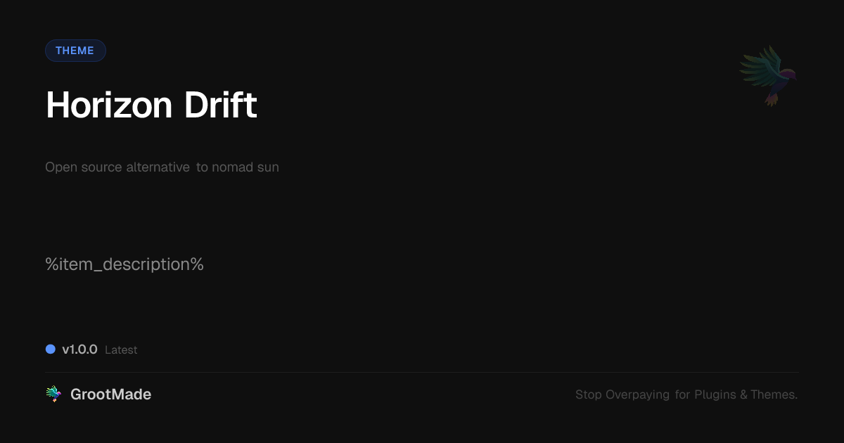 GrootMade is NOT affiliated with nomad sun or its original author. nomad sun™ is a trademark of its respective owner and use of it does not imply any endorsement or affiliation. This product has been forked under the GNU General Public License (GPL) and all non-GPL assets (such as proprietary images, fonts, and branding) have been removed. Distributing GPL-licensed code is 100% legal.