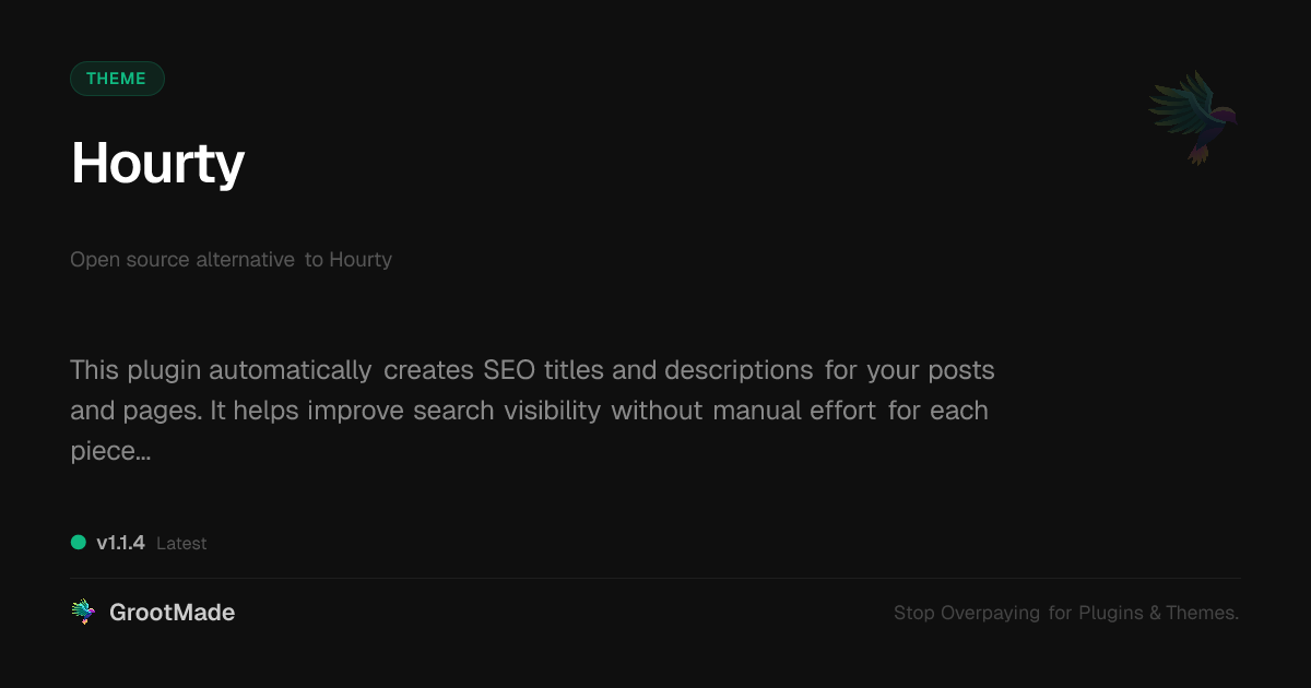 GrootMade is NOT affiliated with Hourty or its original author. Hourty™ is a trademark of its respective owner and use of it does not imply any endorsement or affiliation. This product has been forked under the GNU General Public License (GPL) and all non-GPL assets (such as proprietary images, fonts, and branding) have been removed. Distributing GPL-licensed code is 100% legal.
