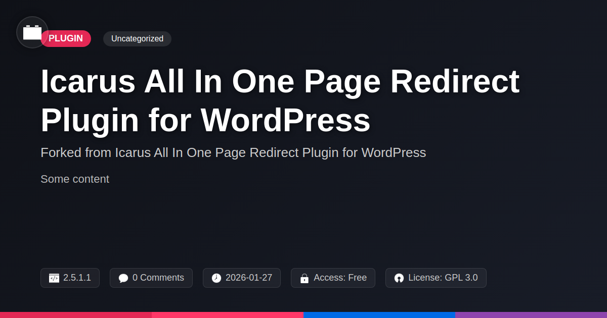 GrootMade is NOT affiliated with Icarus All In One Page Redirect Plugin for WordPress or its original author. Icarus All In One Page Redirect Plugin for WordPress™ is a trademark of its respective owner and use of it does not imply any endorsement or affiliation. This product has been forked under the GNU General Public License (GPL) and all non-GPL assets (such as proprietary images, fonts, and branding) have been removed. Distributing GPL-licensed code is 100% legal.